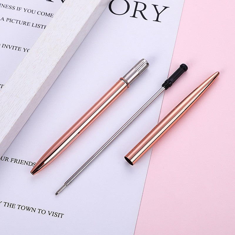 Upgrade your writing experience to a whole new level with our sophisticated metallic ballpoint pens. Crafted with precision and style, these pens are guaranteed to elevate your writing game with their smooth black ink flow. Whether you’re jotting down notes, signing documents, or simply expressing your creativity on paper, these pens are the perfect tool for the job.One of the standout features of our pens is their innovative design. 6.42′ L x 0.28′ W