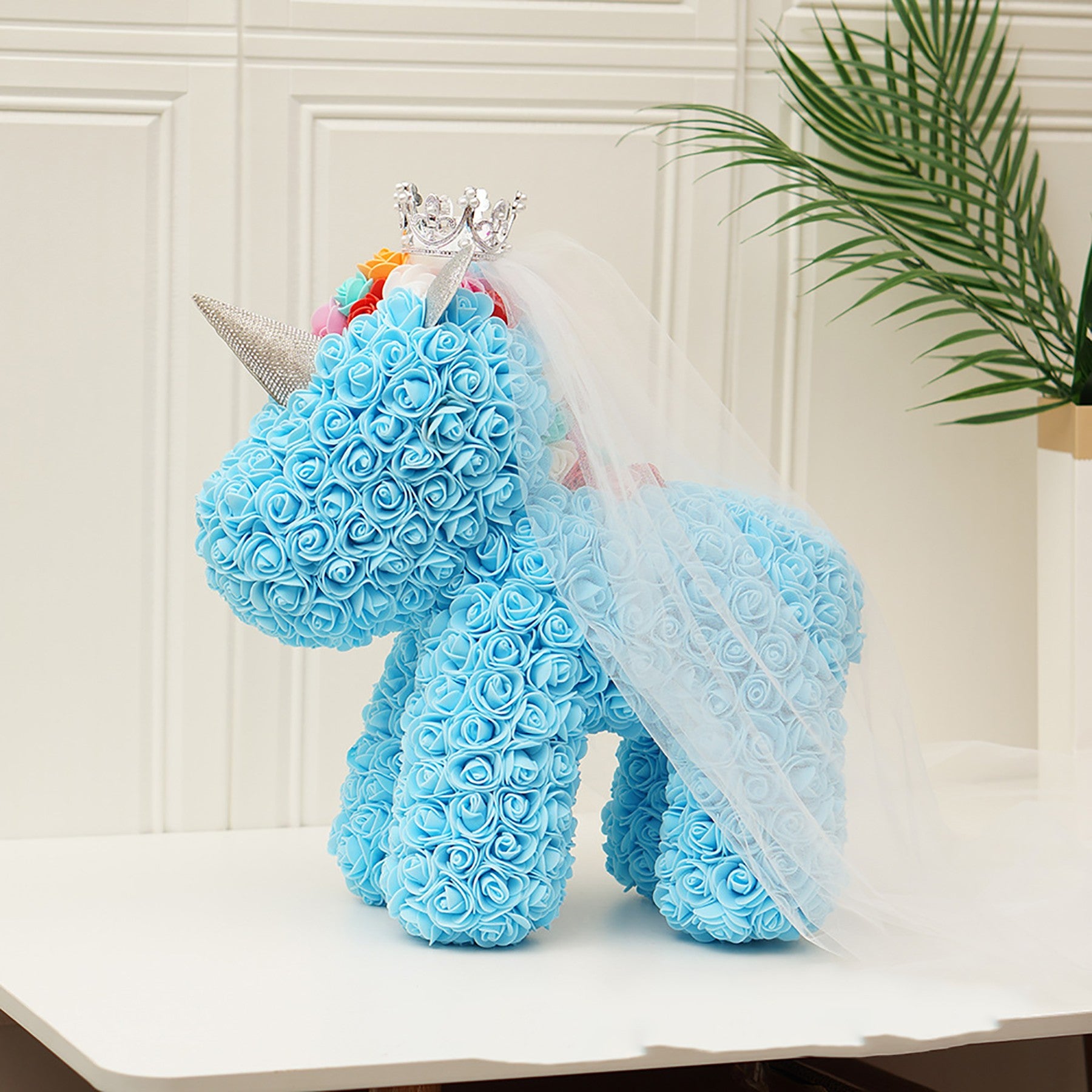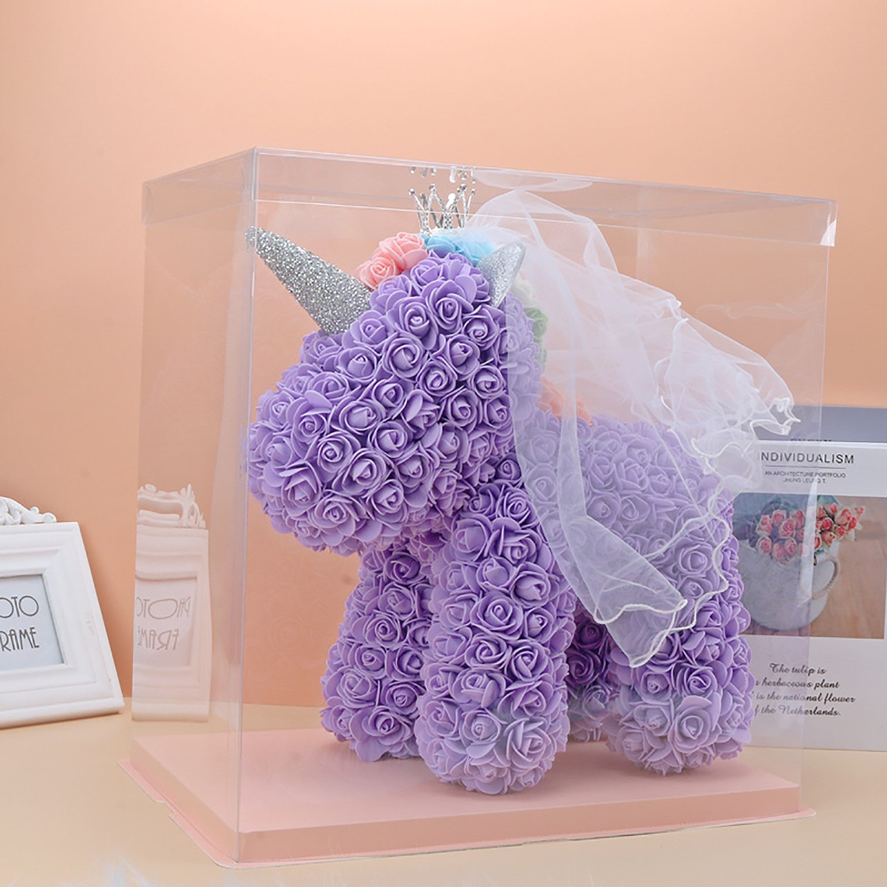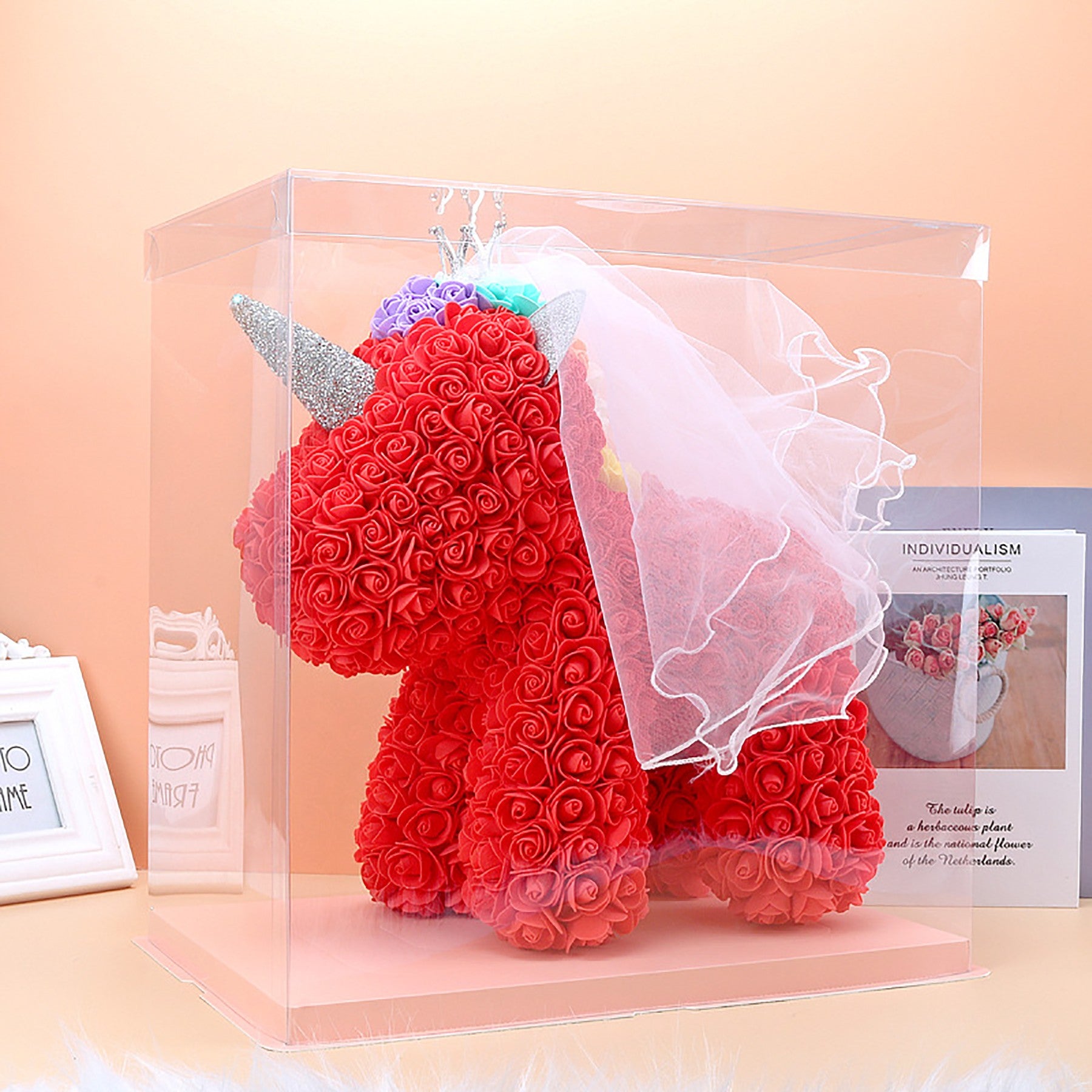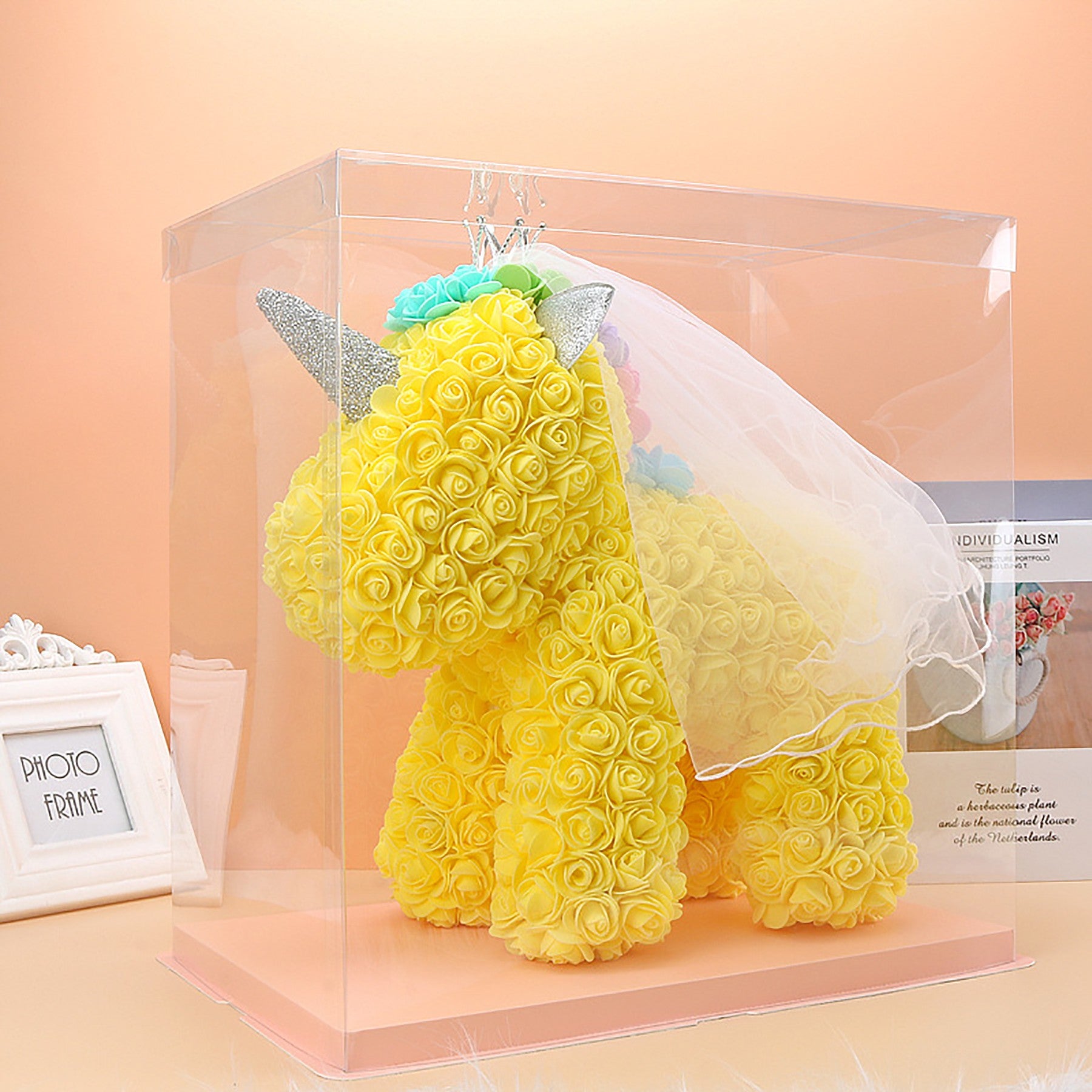 The rose flower unicorn is a romantic and lovely design made of artificial flowers. It is packaged in a clear plastic gift box, making it a perfect gift for lovers, kids, and friends for any occasion like anniversaries, birthdays, weddings, Valentine’s Day, or as a unique and precious gift option. 15 3/4″ L x 9 1/2″ W x 15 3/4″ H