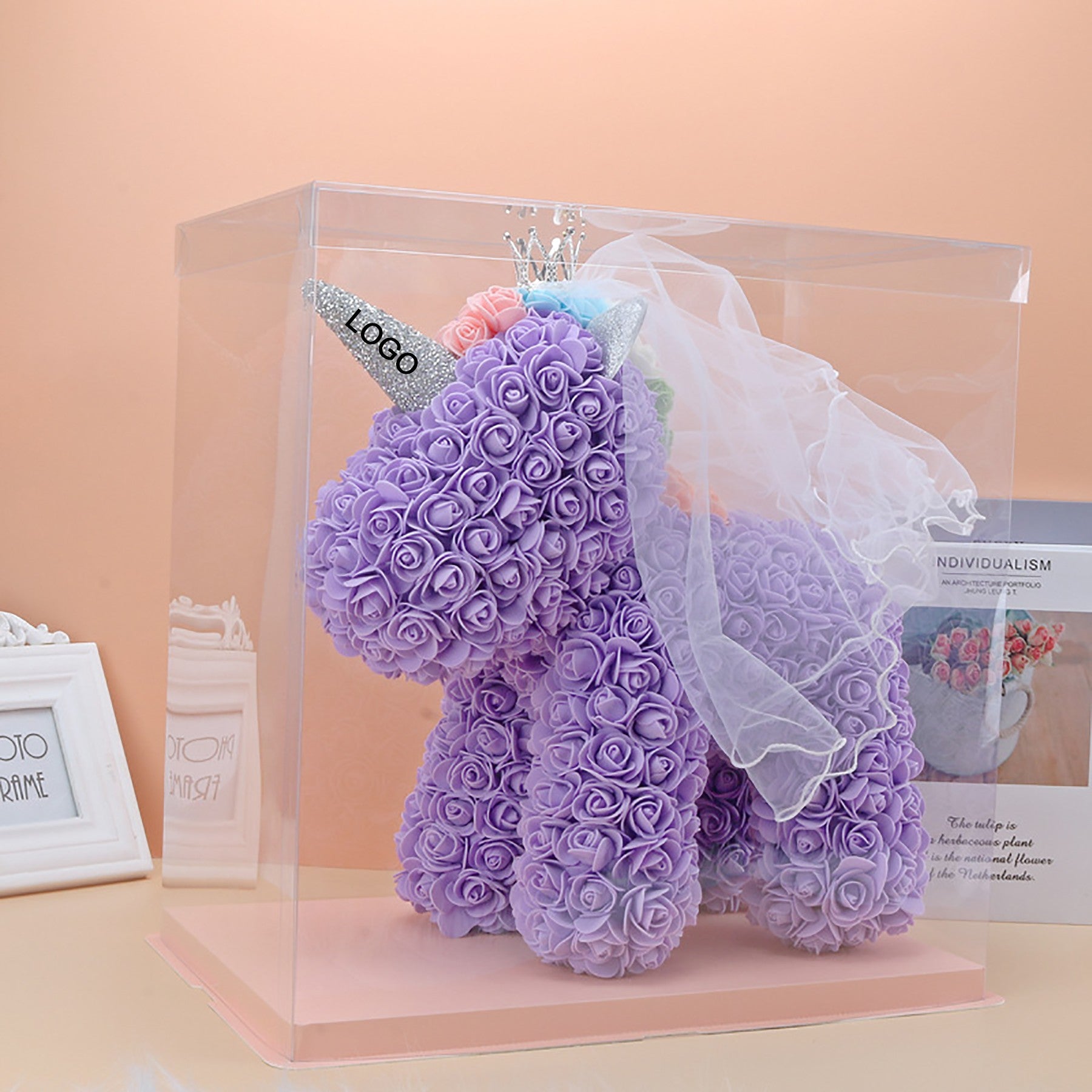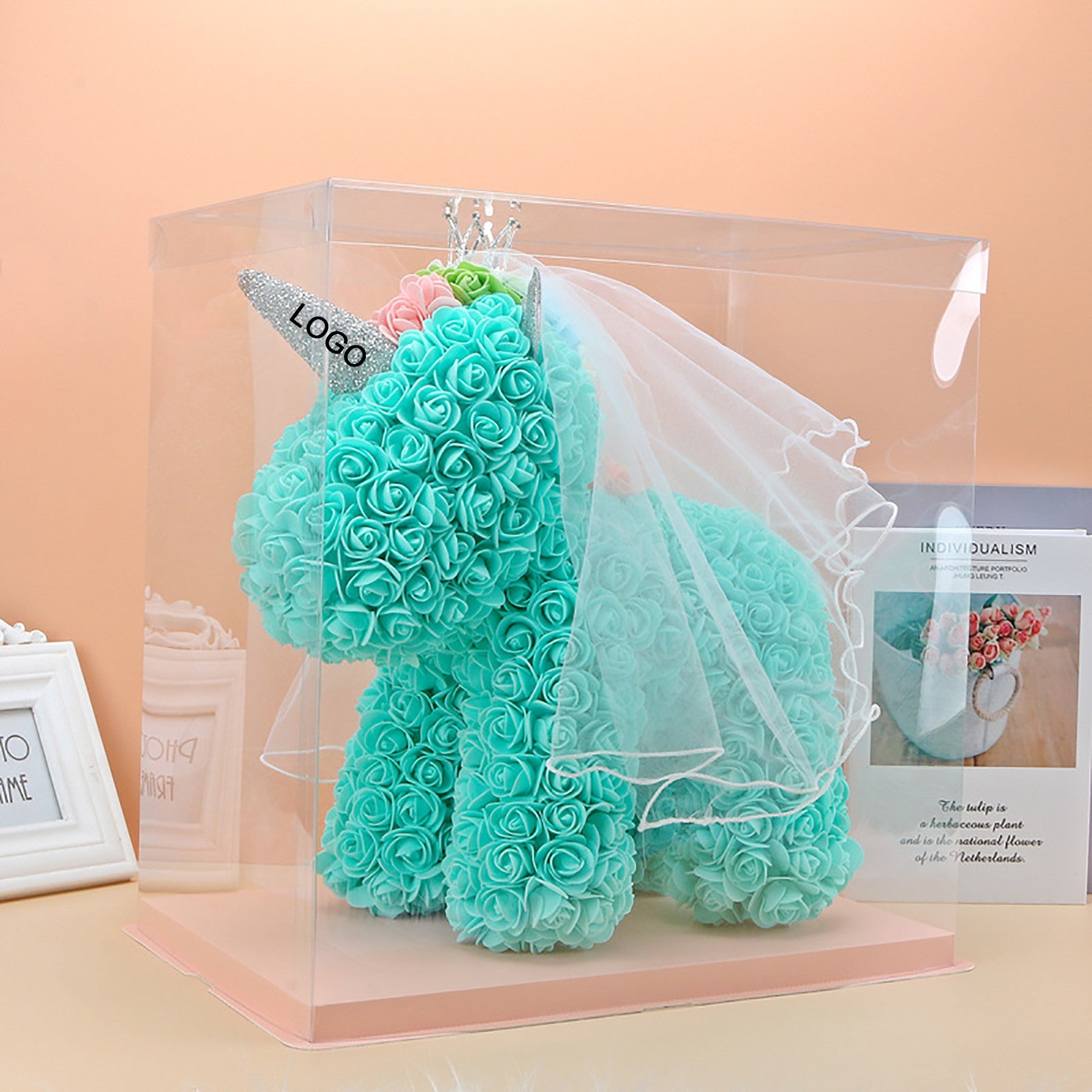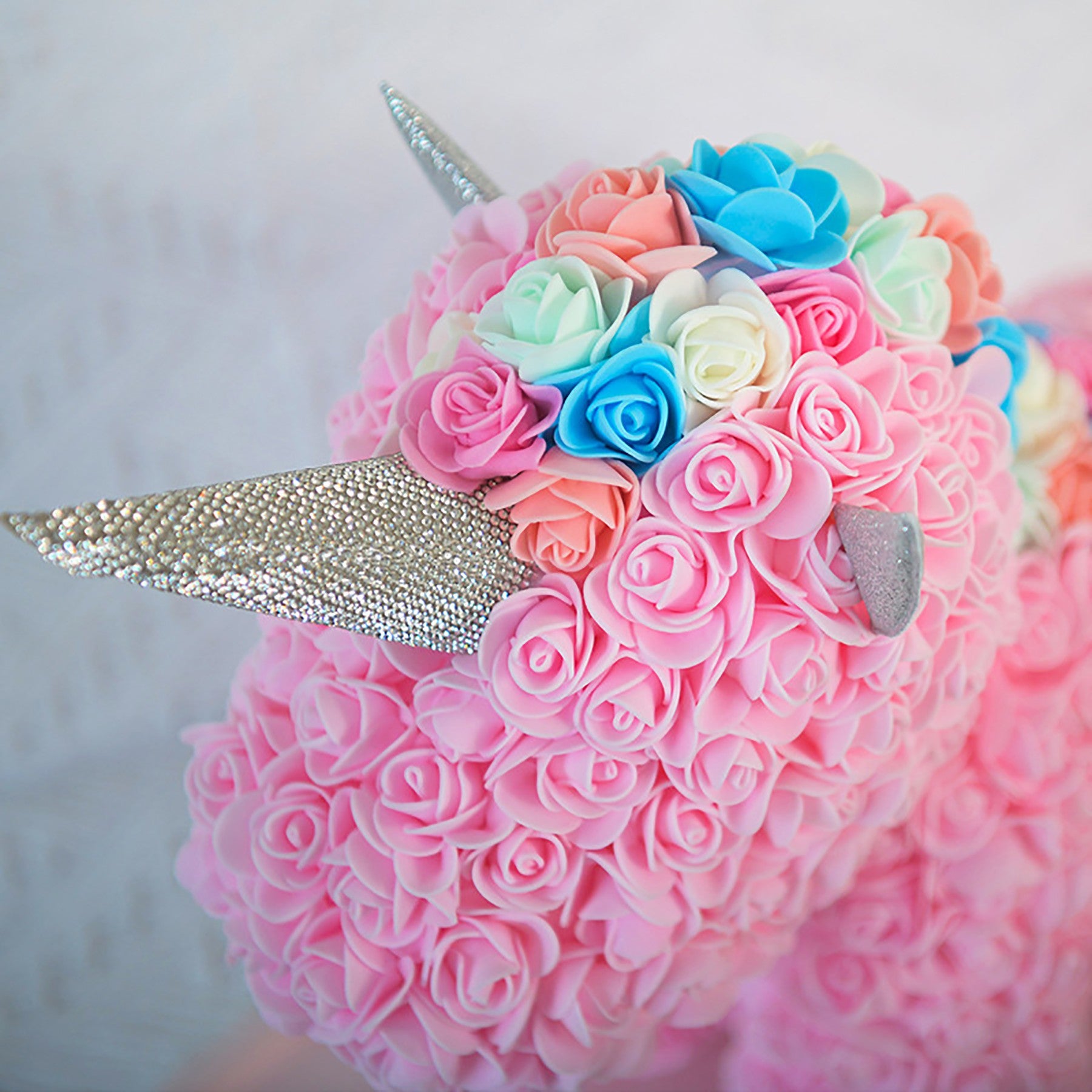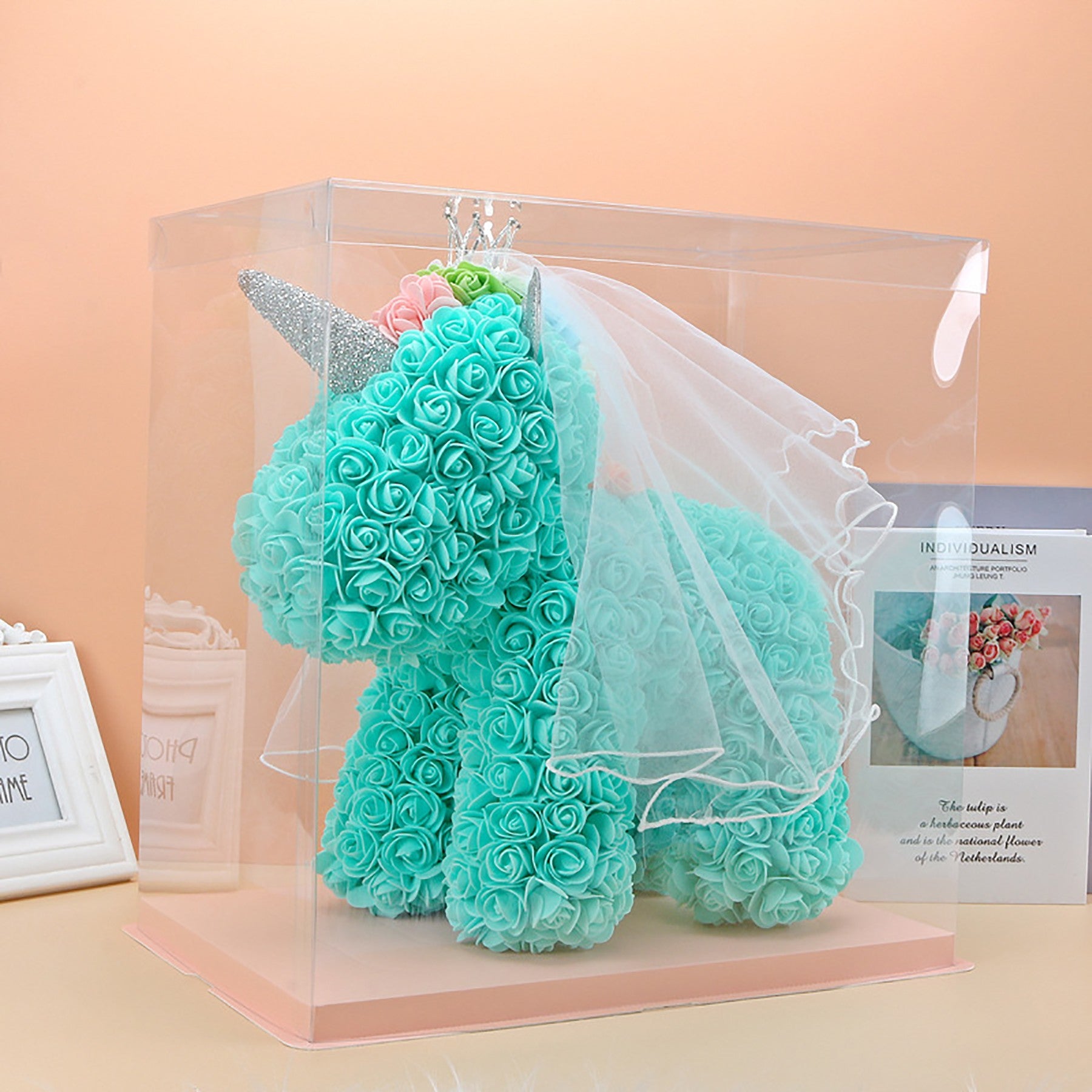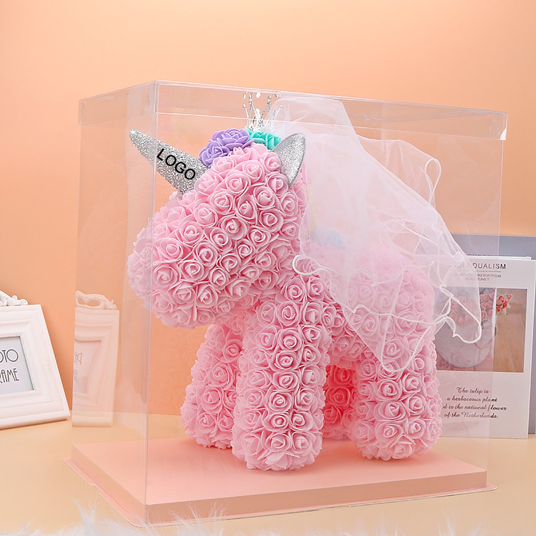 The rose flower unicorn is a romantic and lovely design made of artificial flowers. It is packaged in a clear plastic gift box, making it a perfect gift for lovers, kids, and friends for any occasion like anniversaries, birthdays, weddings, Valentine’s Day, or as a unique and precious gift option. 15 3/4″ L x 9 1/2″ W x 15 3/4″ H